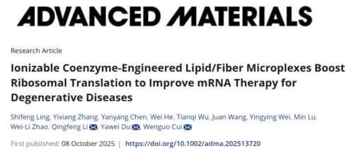 【Advanced Materials】杜亚伟副研究员开发可电离辅酶Q10提升mRNA翻译发表时间:2025-10-17 14:53 2025年10月,杜亚伟副研究员在《Advanced Materials》【IF 26.8,Q1】杂志在线发表题名为“Ionizable coenzyme-engineered lipid/fiber microplexes boost ribosomal translation to improve mRNA therapy for degenerative diseases”.——可电离辅酶Q10工程化LNP/纤维复合物通过增强核糖体翻译助力退行性疾病mRNA治疗的论文。 瑞金医院/上海市伤骨科研究所杜亚伟副研究员等为论文的共同通讯作者;凌世烽博士后、陈艳阳博士后等为论文的共同第一作者。